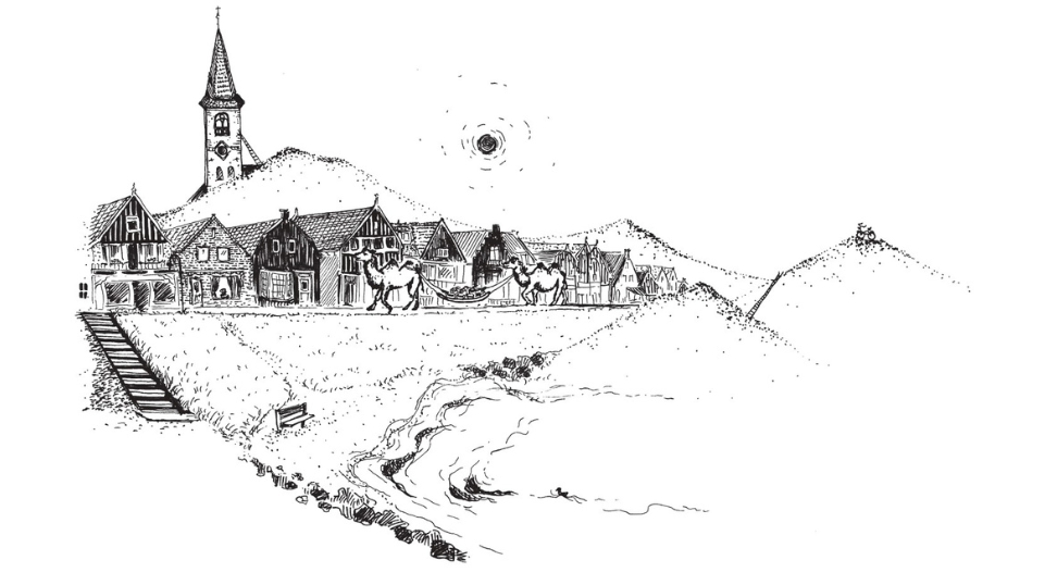 Jentje meed de grote wegen en reed het laatste stuk vanaf Amsterdam langs de Zeedijk. “Ik moet mijn kamelen kwijt zien te raken,” sprak Jentje in zichzelf, wat iedereen zou doen die helemaal vanaf Afrika op een kameel naar Volendam zou gaan. Moest hij bij zijn moeder op het stoepie aankomen met twee van die beesten met van die doorgezakte, halfronde verhevenheden op hun rug? Jentjes minikaravaan kwam aan op het Zuideinde van het dorp. Jentje begon meteen te schreeuwen: “Kamééééle! Ik heb mooie kamééééle!” Het galmde tegen de geveltjes! Dat was nog eens wat anders dan: “Lekkere bókkeme” of “Gerookte ponen”! In ’n mum van tijd was de dijk van zuid tot noord in rep en roer! “Jentje van Lijpie Emmelukkie is terug en heeft kamelen te koop!”